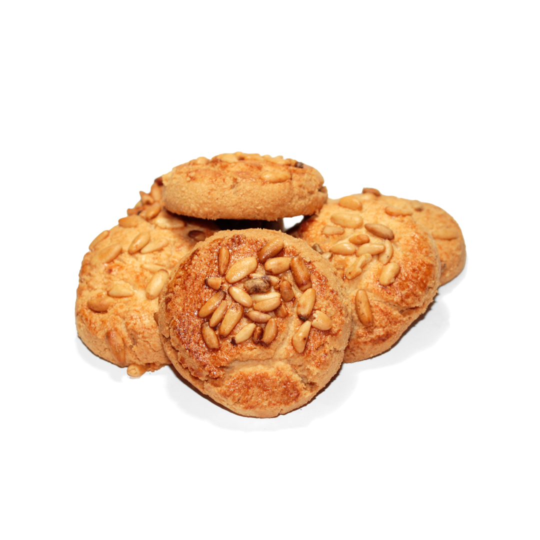 Deliciosas y crujientes pastas elaboradas artesanalmente con cobertura de piñones de Castilla.