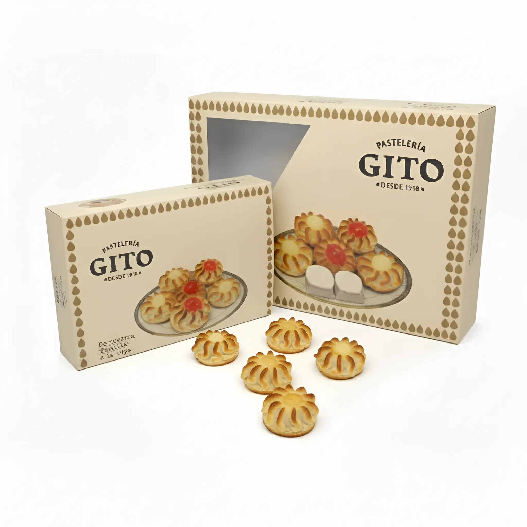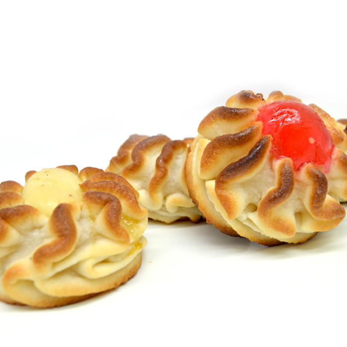 Deliciosa pasta de mazapán elaborado de manera artesanal con manga pastelera y decorada con almendras y guindas en almíbar.