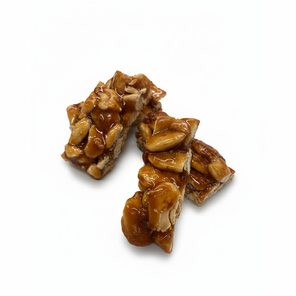 Turrón crujiente elaborado con almendras enteras y caramelo. Su textura firme y su sabor dulce lo convierten en un clásico ideal para quienes disfrutan de los turrones tradicionales. Perfecto para acompañar sobremesas o para tomar como pequeño capricho en cualquier momento. Se presenta en porciones individuales.